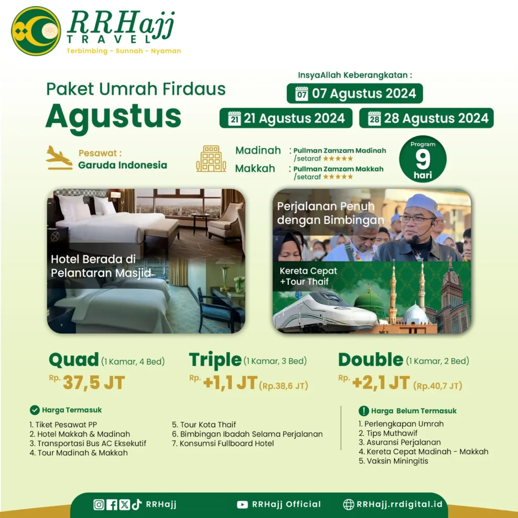 Paket Umrah Raniaah dirancang khusus untuk menghadirkan pengalaman ibadah yang khusyuk, nyaman, dan penuh makna. Dengan pelayanan terbaik, fasilitas modern, serta pendampingan penuh dari tim berpengalaman, setiap jamaah akan merasa tenang sejak keberangkatan hingga kembali ke tanah air.